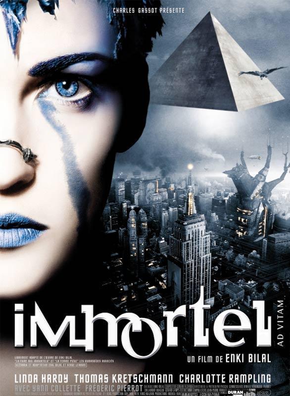 | Crítica |  Puntuación del crítico: 6 | La historia gira alrededor de Jill Bioskop, para los que no conozcan el trabajo de Bilal pensarán que Immortel es una imitación del 5to elemento. Esto debido a que Jill es importante para ambos lados del conflicto que se desarrolla en esta película. Sin embargo, el trabajo de Bilal le da carácter propio a la realización cinematográfica, incluso en las animaciones y escenografías las cuales son muy fieles y como era de esperar, algo acartonadas. Todo empieza con una pirámide gigantesca que flota sobre el río de Hudson en Nueva York que, como París en la novela, cuenta con dos tipos de pobladores: los afortunados elitistas en el poder y la clase desamparada y restringida en los suburbios. De la pirámide desciende Horus, el dios halcón, al cual le conceden el derecho de bajar a la tierra para estar entre los mortales una vez más antes de ratificar su eternidad en 7 días.